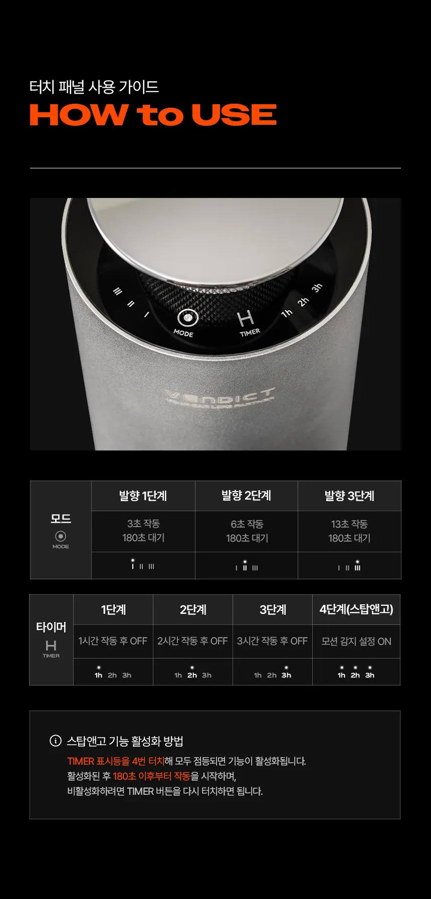 III : 13초 작동 / 180초 대기 (대형 차량 및 실내공간, 아주 빠른 발향