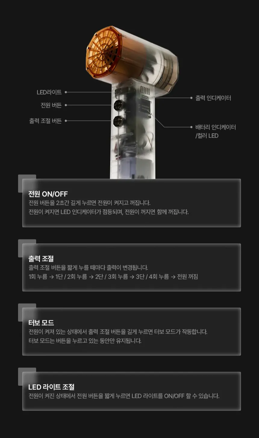 터보 모드는 초기 약 1200G의 추력을 제공하나, 약 20초 후 과열 방지 안전 설계에 따라 출력이 자동으로 단계적으로 낮아집니다.