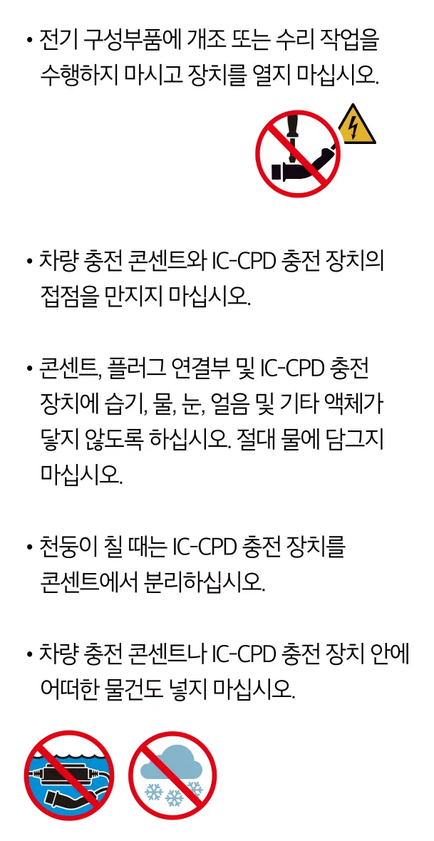 습기나 물이 충전기 내부에 들어갈 경우, 전기 충격이나 화재의 위험이 있습니다. 안전한 사용을 위해 건조한 장소에서 충전기를 사용하고, 비나 눈이 오는 날씨에는 사용을 자제해 주시기 바랍니다.