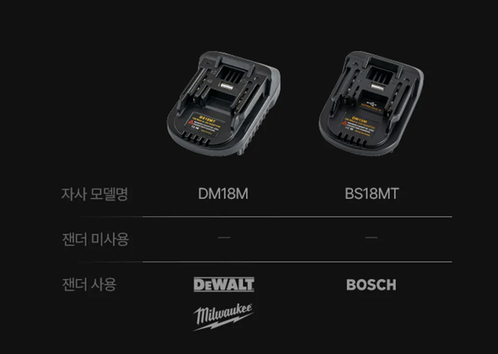 배터리 젠더 본 제품은 벤딕트 18V 폴리셔 전용 배터리와 호환됩니다. 그러나 전용 젠더를 사용하면 마키타, 디월트, 보쉬, 밀워키 배터리도 함께 사용 가능합니다.