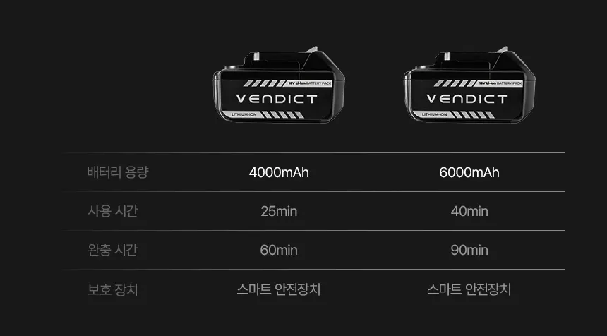 배터리 용량에 따라 작업 시간이 달라지므로, 장시간 작업을 원하시면 6,000mAh 배터리를 선택하는 것이 좋습니다.