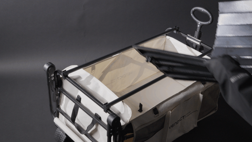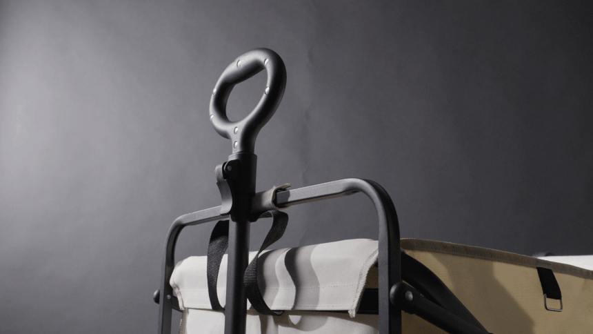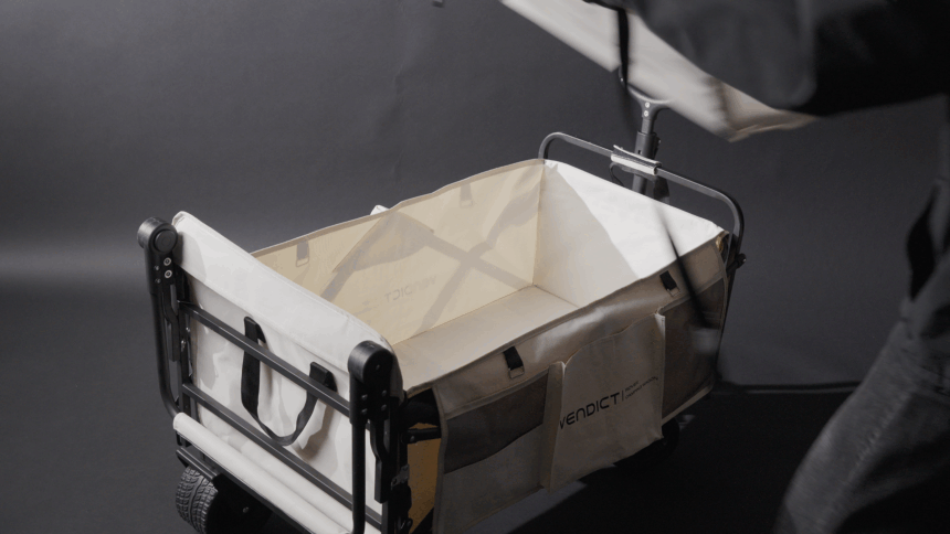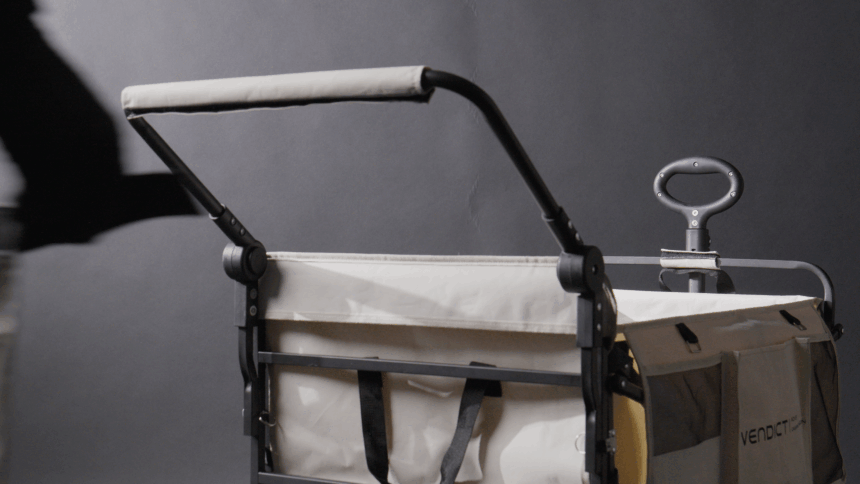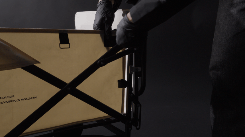 좌우의 프레임을 잡고 펼쳐서 웨건을 세웁니다.
