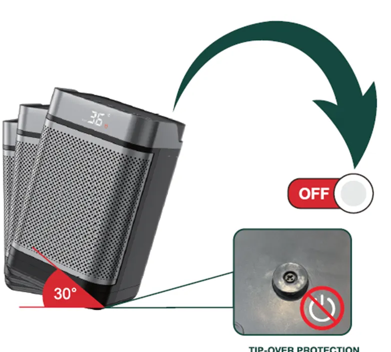 히터가 앞으로 또는 뒤로 기울어지거나, 실수로 넘어질 경우, 하단에 있는 전도 방지 스위치가 작동하여 자동으로 전원이 꺼집니다.사용 시 반드시 평평한 표면에 놓으십시오.