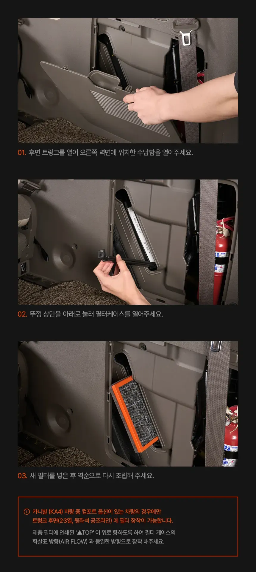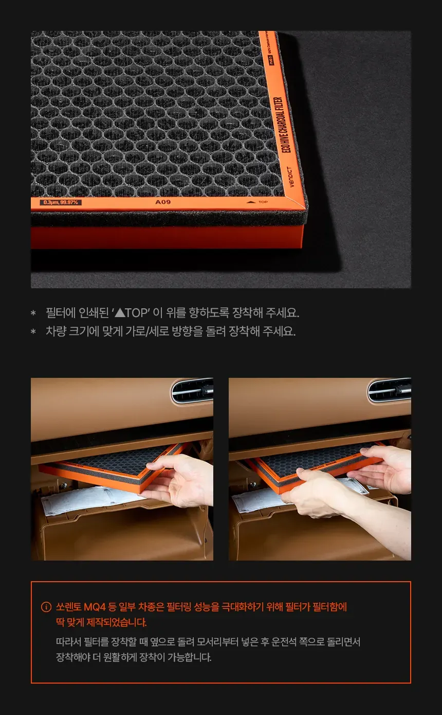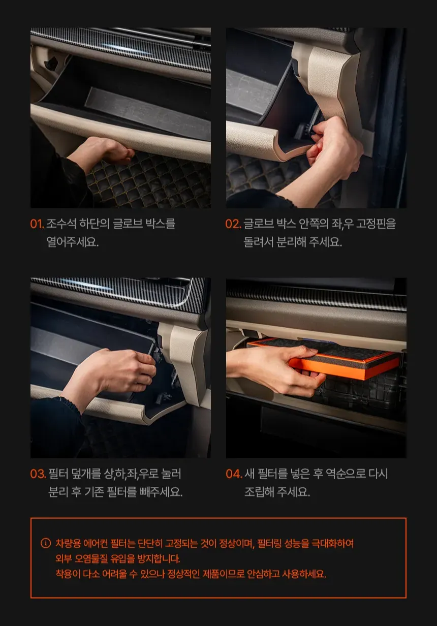 그랑 콜레오스 모델의 경우, 공조 시스템 설계 특성상 필터 케이스 내부의 간섭 부위가 존재합니다. 제품 변형 방지와 완벽한 밀착을 위해 아래의 프로세스에 따라 장착을 진행해 주십시오.