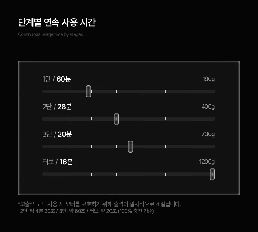 터보 모드는 초기 약 1200g의 추력을 제공하나, 약 20초 후 과열 방지 안전 설계에 따라 출력이 자동으로 단계적으로 낮아집니다.