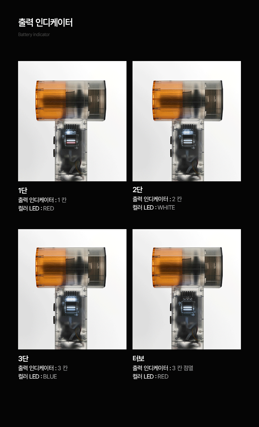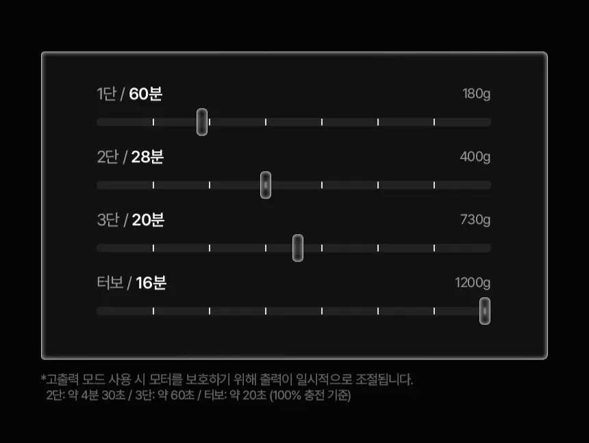 터보 모드는 초기 약 1200g의 추력을 제공하나, 약 20초 후 과열 방지 안전 설계에 따라 출력이 자동으로 단계적으로 낮아집니다.