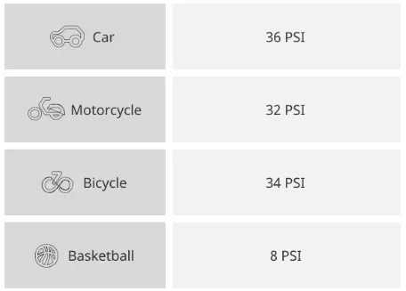 아래 설정값은 기본 설정값 입니다. 자동차, 자전거 및 오토바이 타이어 공기압 주입 시 타이어에 기재된 입력범위를 반드시 확인 바랍니다.