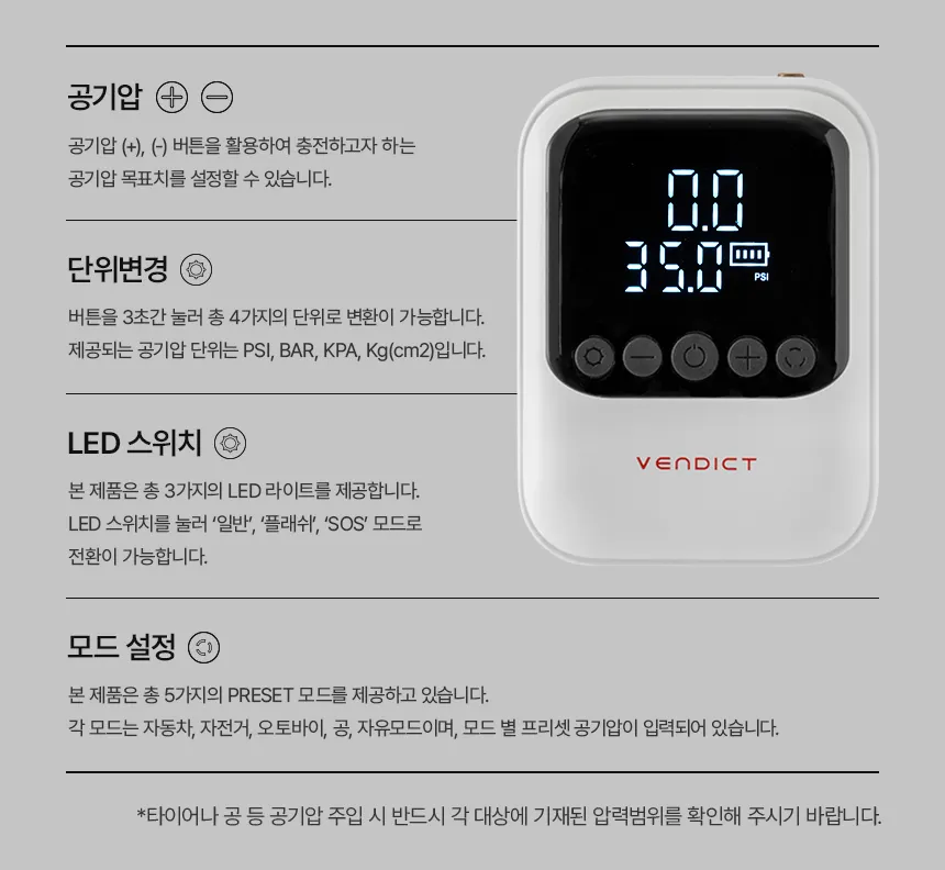 LED스위치 버튼 본 제품은 총 3가지의 LED 라이트를 제공합니다. LED스위치를 눌러 ‘일반’, ‘플래쉬’, ‘ SOS’ 모드로 전환이 가능합니다. 모드설정 버튼 본 제품은 총 5가지 모드의 PRESET 모드를 제공하고 있습니다. 각 모드는 자동차, 자전거, 오토바 이, 공 자유모드 이며, 모드 별 프리셋 공기압이 입력되어 있습니다.