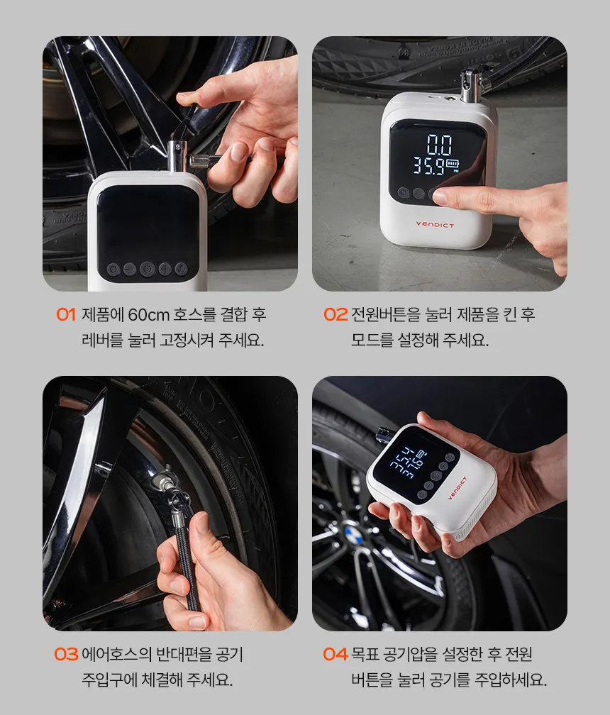 (+) (-) 버튼으로 원하는 공기압 목표치를 설정합니다. 0.1 단위까지 세밀하게 조절 가능해 정밀한 설정이 가능합니다. 에어호스를 타이어 밸브에 단단히 체결해 주세요. 설정이 완료되면 시작 버튼(전원 버튼)을 한 번 눌러 주입을 시작합니다.
