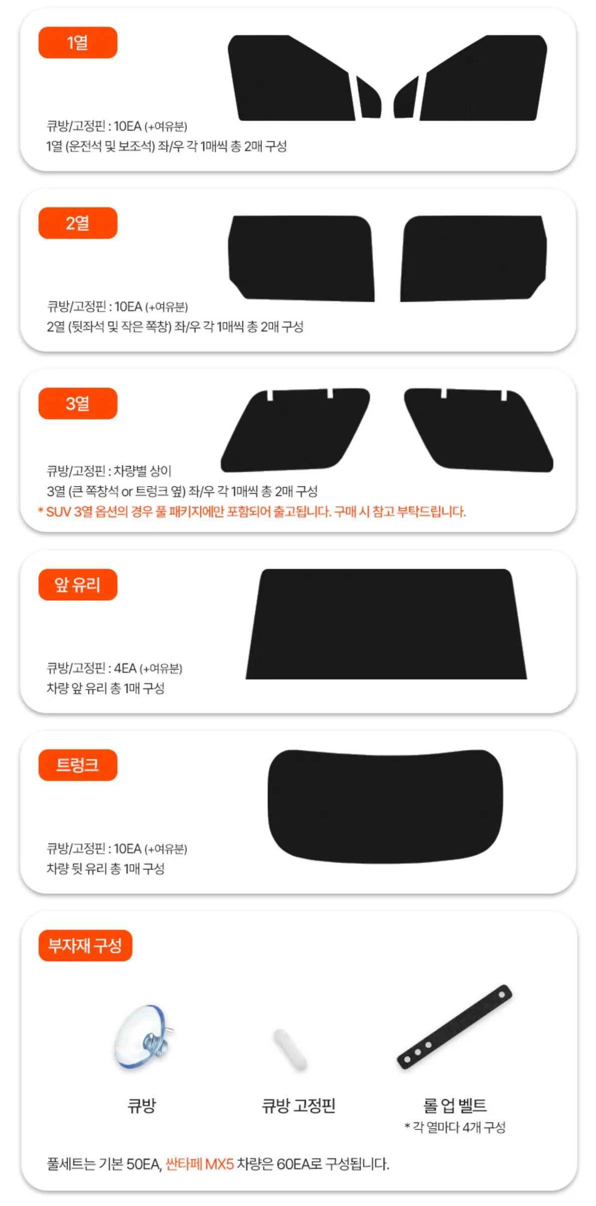 주문한 햇빛가리개 부위만 발송이 되며, 부자재는 동일 합니다