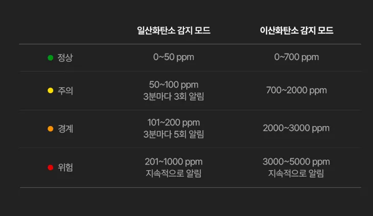 필요에 따라 일산화탄소와 이산화탄소의 경보 기준을 직접 설정할 수 있습니다. 예시) 더 민감하게 설정하고 싶은 경우, 경보가 너무 자주 울리는 경우 등