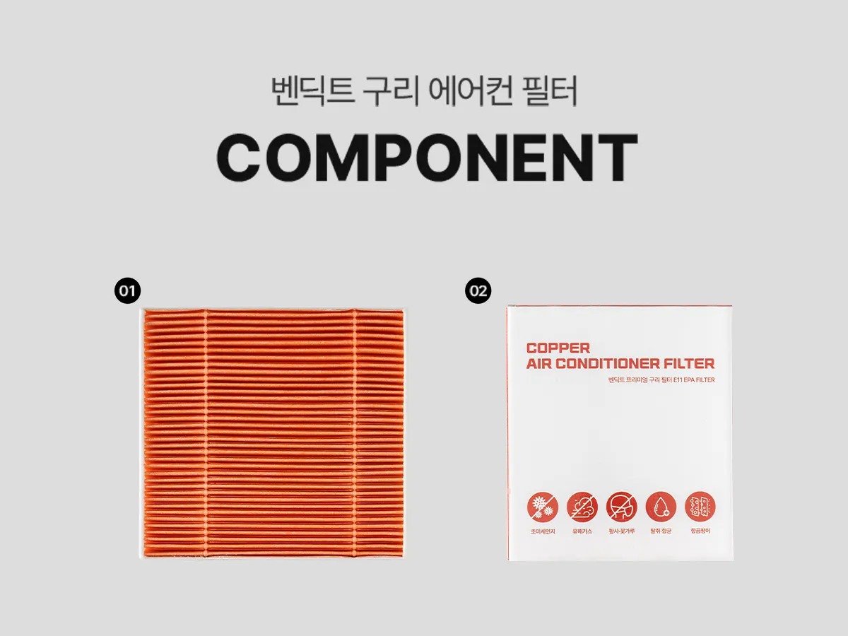 벤딕트 구리 에어컨 필터는 차량 내부로 유입되는 공기를 보다 위생적으로 관리하기 위한 차량용 에어컨·히터 필터입니다.