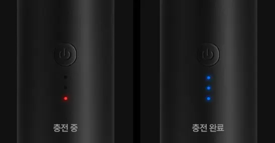 충전기 분리 후 전원 버튼을 눌러 LED 잔량을 확인하세요. 충전 중: 붉은 LED 1개 점등 완충 시: 파란 LED 3개 점등