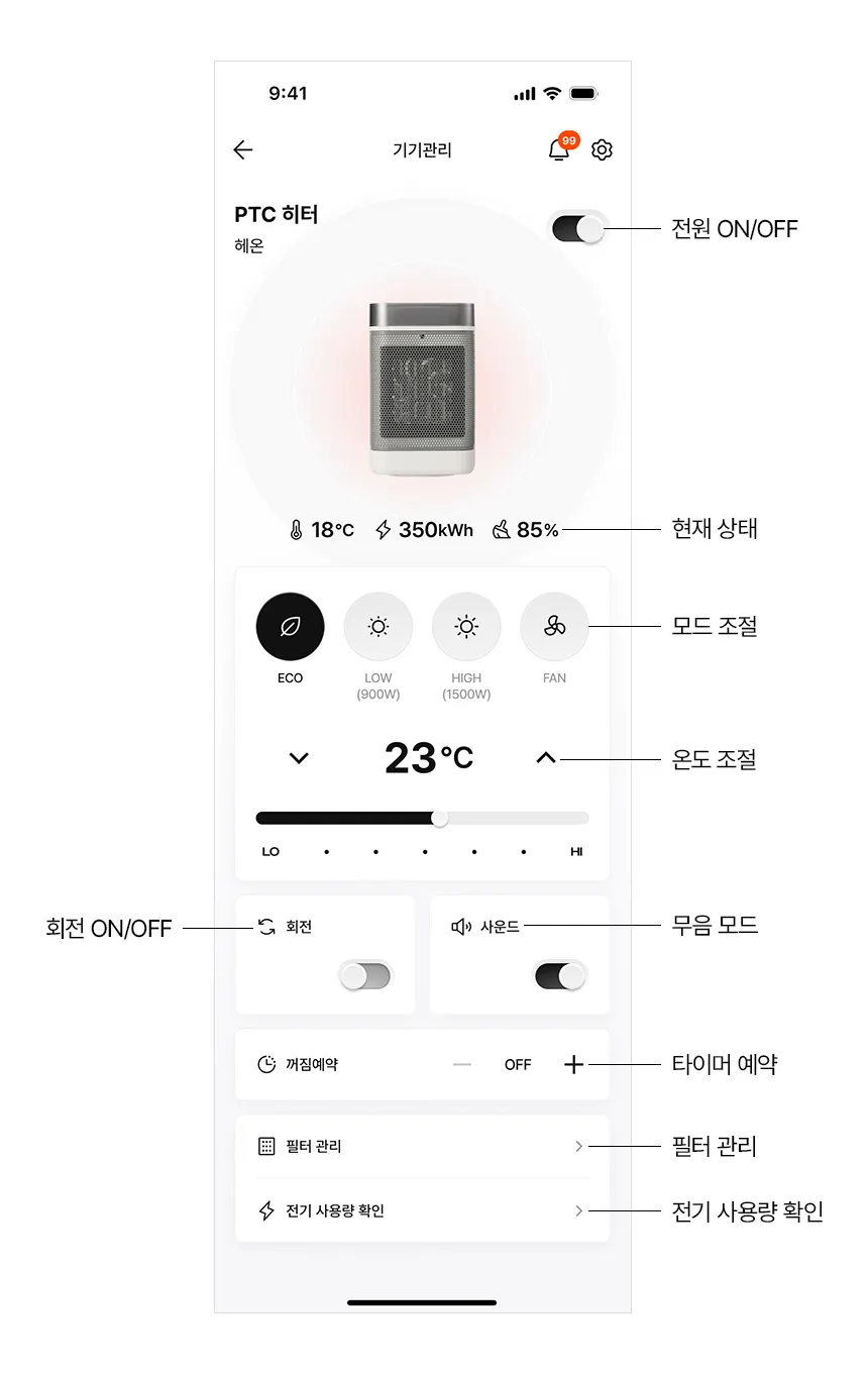 켜짐 예약 시간이 되면 히터는 지정된 온도와 회전 방식으로 자동 운전합니다.