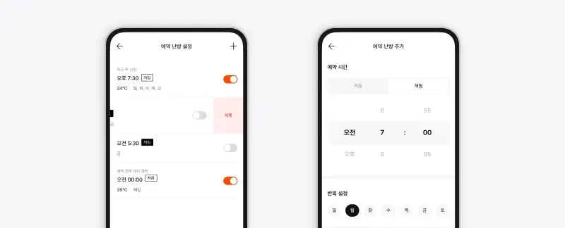 안전한 사용을 위해 켜짐 예약을 설정한 경우, 꺼짐 예약도 해당 시간에 맞춰 함께 설정해 주세요.