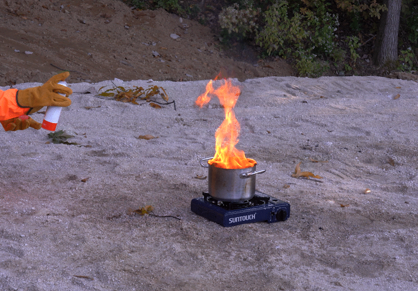 화염의 중심부를 향해 넓게 분사하면, 강화액이 불길을 빠르게 냉각시킵니다.