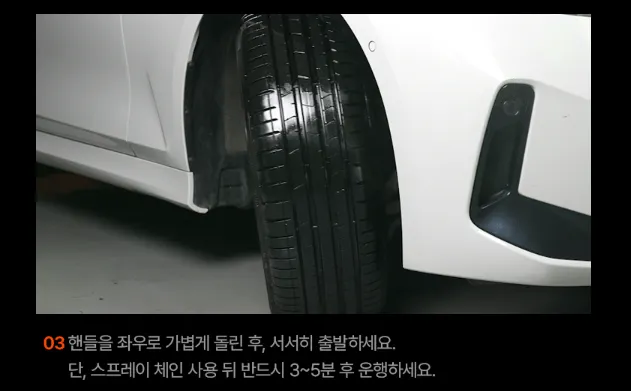 분사 후 용액이 타이어에 충분히 고착될 수 있도록 약 3~5분간 대기해 주세요.