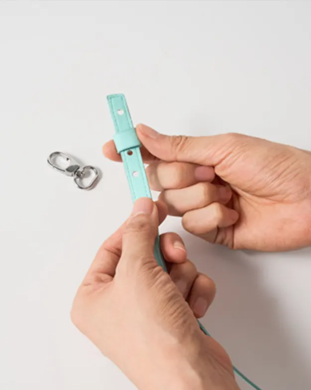 레더 스트랩을 링 카라비너에 끼우고, 어드저스터를 다시 조립합니다.