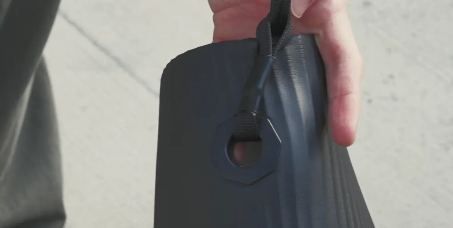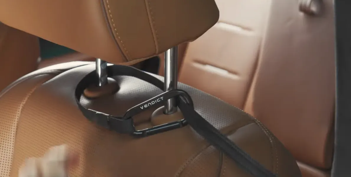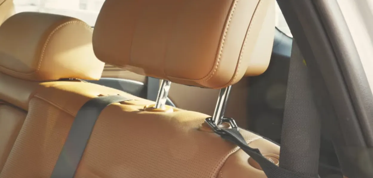 도난방지 끈의 반대쪽 끝을 헤드레스트 기둥에 묶거나 카라비너를 이용해 단단히 고정합니다.