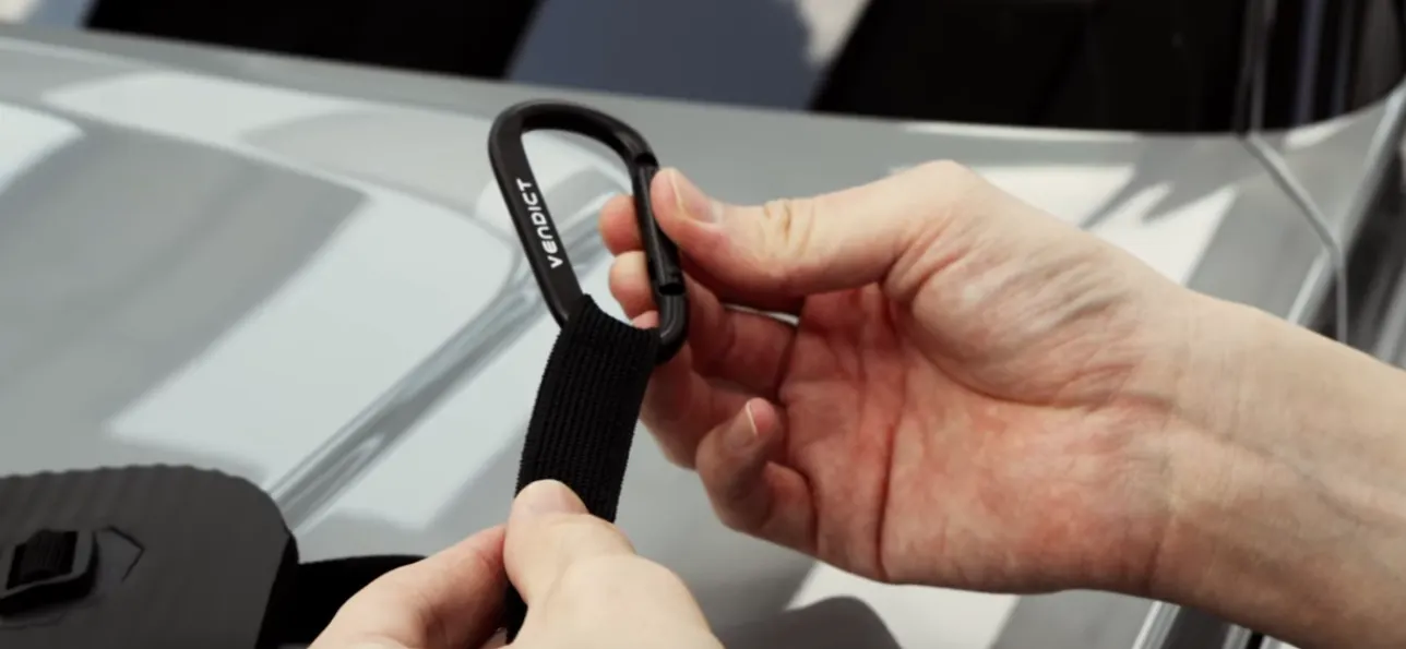 벨크로 스트랩과 카라비너를 연결해주세요