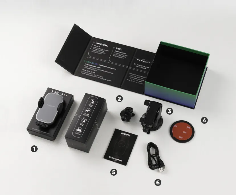 VDT-014 무선 충전 거치대는 주행 중 스마트폰 사용의 안정성과 편의성을 극대화하기 위해 설계된 기능 중심의 디자인입니다.
