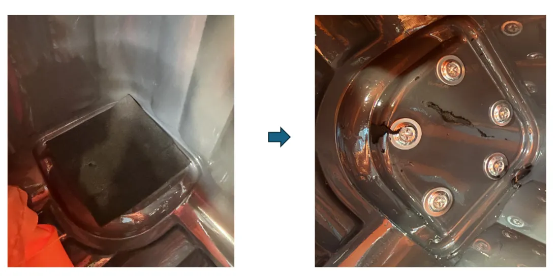 첫 번째 사진과 같이 나사 머리 부분이 짐이나 안감을 손상시키지 않도록, 동봉된 흡착 폼(또는 보호 스티커)을 나사 위에 부착하여 마감합니다.