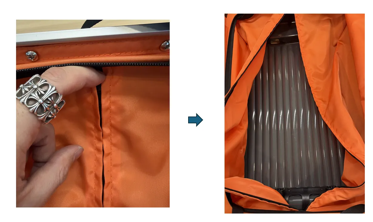 캐리어 내부의 안감을 분리하기 위해 정비용 지퍼를 엽니다.