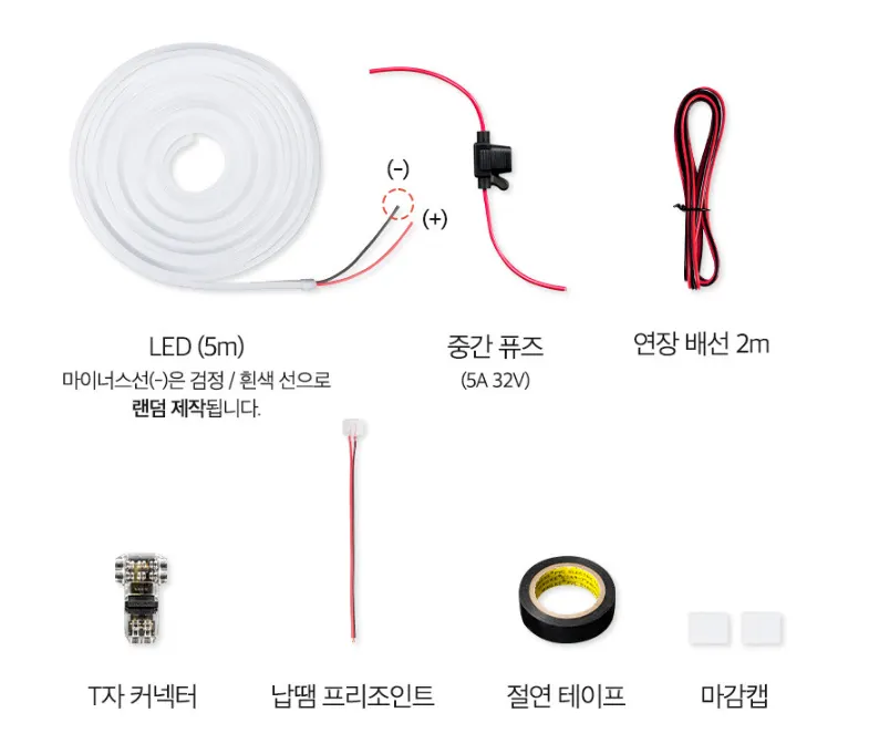 LED, 퓨즈, 연장 배선, 커넥터, 절연 테이프, 마감캡 포함 추가 구매 없이 바로 설치 가능
