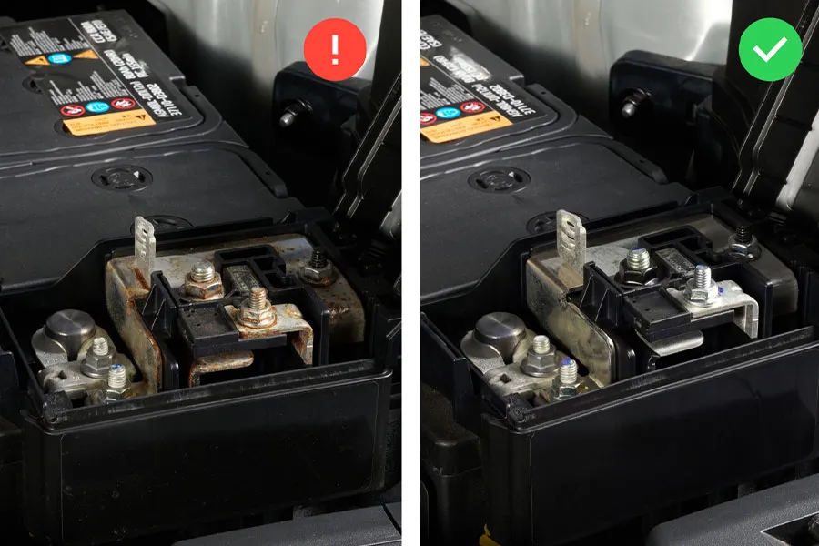 배터리 단자에 부식이 있을 경우, 마른 천이나 철 브러시로 단자 표면을 가볍게 닦은 후 재연결해 주세요.
