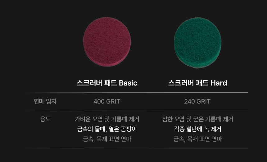 : “스크러버 패드 Hard (240 GRIT)” 사용 → 철판 녹, 찌든 기름때 제거