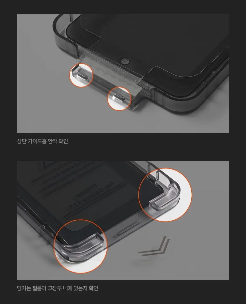 CHECK 02 필름 위치 가이드 필름은 상단 가이드 홀과 하단 필름 고정부에 정확히 안착되어야 정상 부착이 가능합니다. 위치를 벗어나 부착할 경우접착력 저하 및 들뜸이 발생할 수 있습니다.