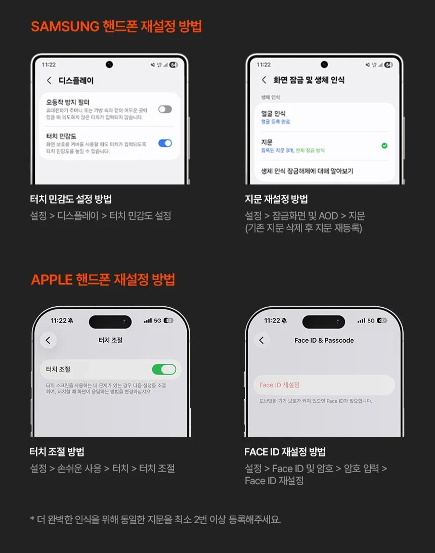 CHECK 01. 생체 인식 재설정 필름 부착 후 지문 인식, Face ID, 터치 민감도 등 기존 등록값의 정확도가 달라질 수 있습니다. 최적의 사용을 위해 생체 인식을 다시 등록 후 사용하시길 권장드립니다.