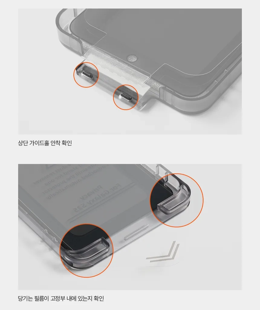 필름은 상단 가이드 홀과 하단 필름 고정부에 정확히 안착되어야 정상 부착이 가능합니다.
