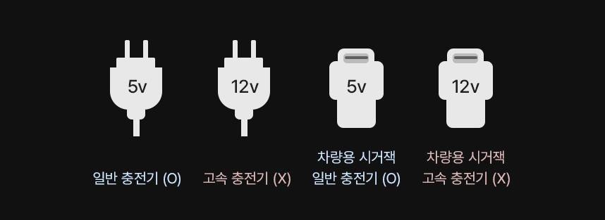 반드시 5V, 1.5A 이하의 일반 충전기를 사용해 주세요.
